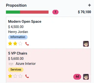 Si un prospect stagne au-delà d’un certain temps dans une étape, Odoo le signale immédiatement. Vous voyez ainsi d'un coup d'œil tout délai ou retard dans la gestion du prospect